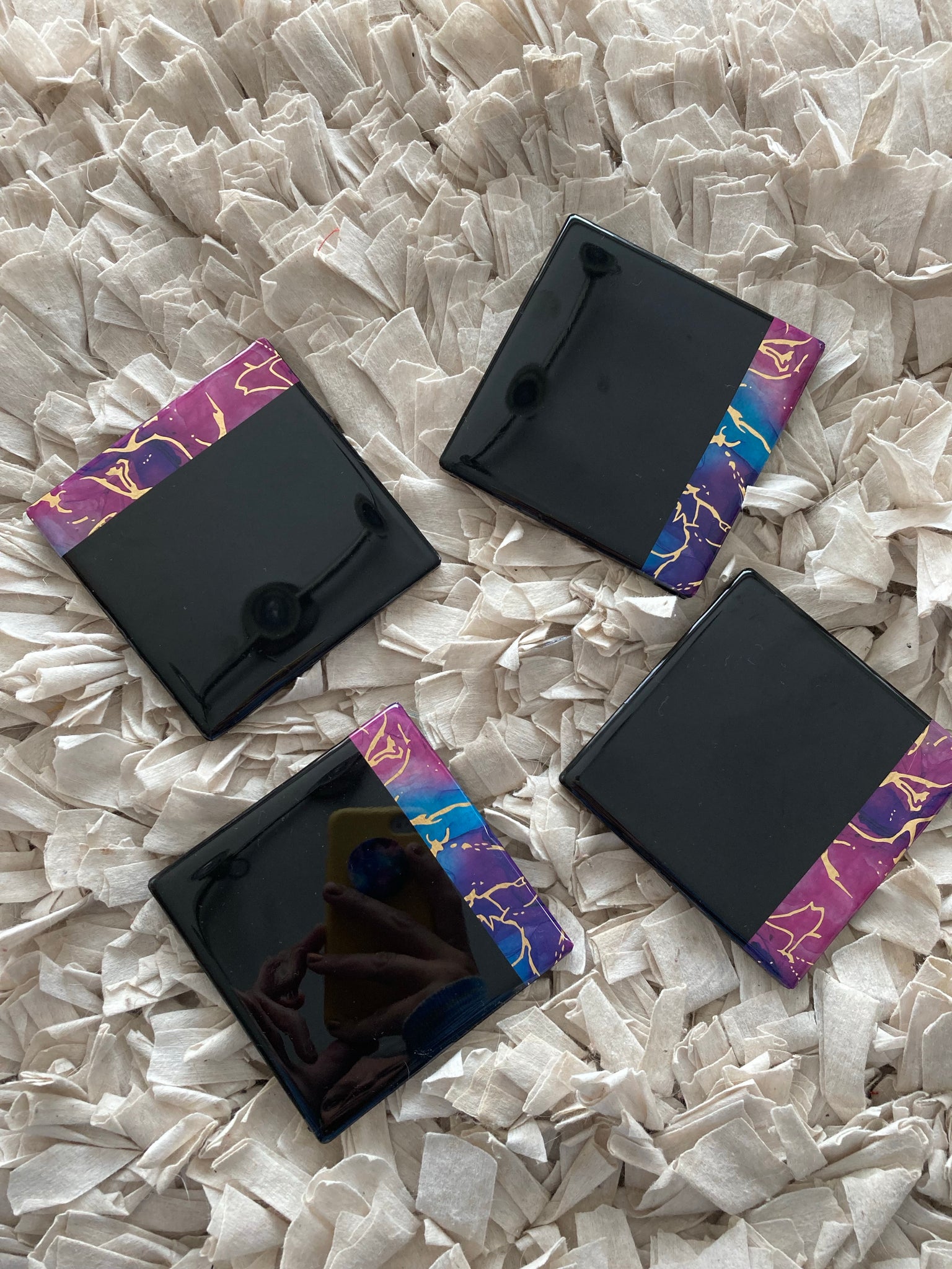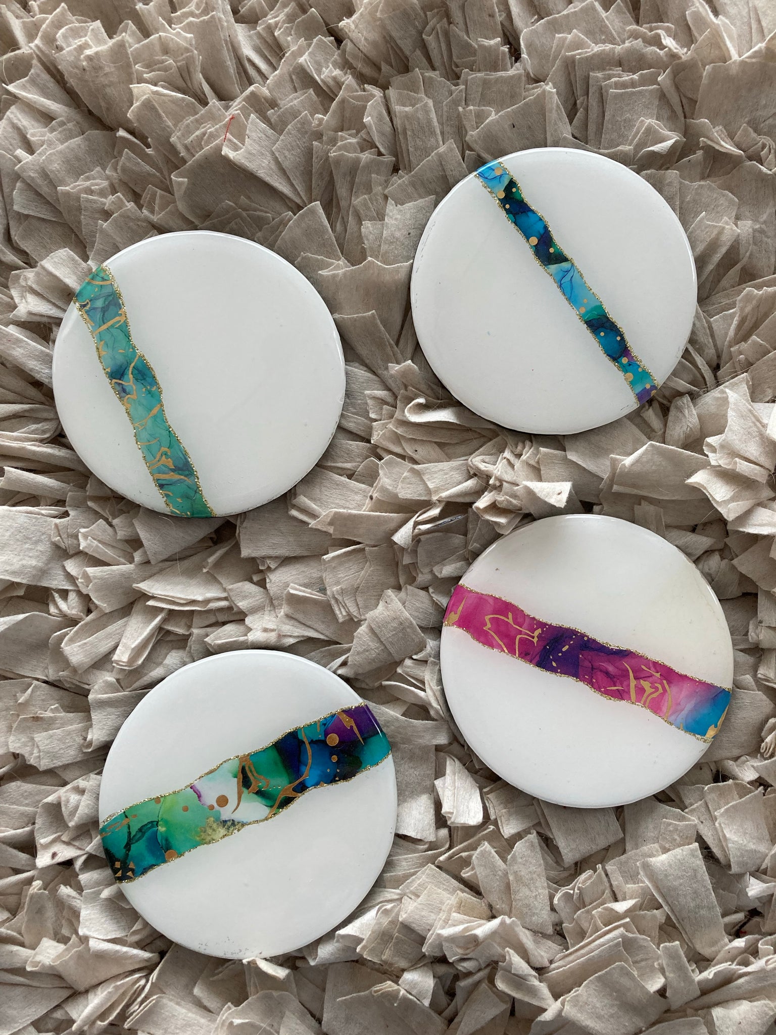 Each coaster set comes as a set of 4. All have been painted and sealed in a heat resistant, water resistant, non toxic and food safe resin.